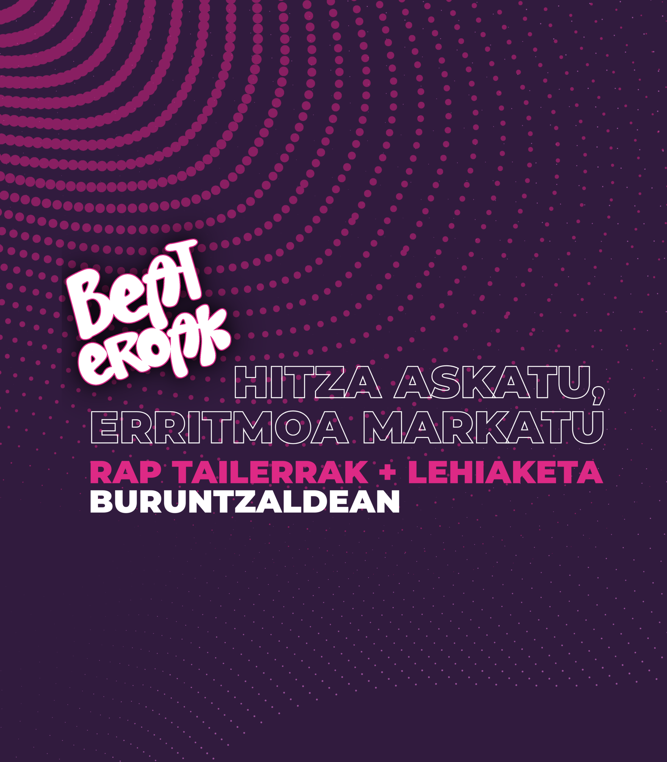BEAT EROAK Buruntzaldean garatuko den rap tailerren eta herri arteko lehiaketaren proiektua da, 12 eta 16 urte bitarteko gazteei zuzendua. Otsailetik martxora bitartean, gazteek raparen bidez adierazteko, kantuak sortzeko eta errimak probatzeko aukera izango dute, bakoitzak bere hitzekin eta bere estiloarekin.